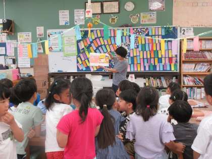 国語の授業で、図書館へ行きました。司書の先生に「11匹のねことあほうどり」という本を読み聞かせてもらいました。夏休み用に5冊本を借りて帰っているので、ゆっくり楽しんでほしいと思います。