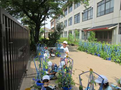 あさがおの花が咲いたので、観察に行きました。最初は小さいたねだったのに、あっという間に子どもたちの身長をこえる高さになったあさがお。夏休みは、お家で大切に育ててください。