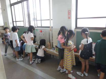 夏休みに頑張って作った自由課題の鑑賞をしました。面白い研究や楽しそうなおもちゃ、素敵な作品などがたくさんあり、お友達の作品の素敵なところをたくさんみつけることができました。