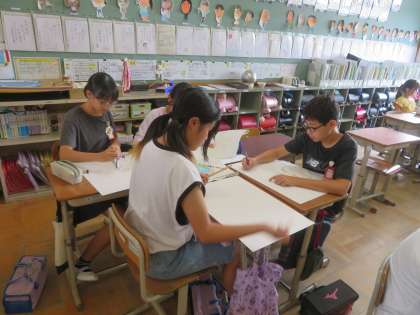 夏休みの間に下描きを考えていた平和ポスターを、画用紙に描いている様子です。手をつないでいる様子など、細部にもこだわって描こうと、写真を見ながら描いている人もいます。
