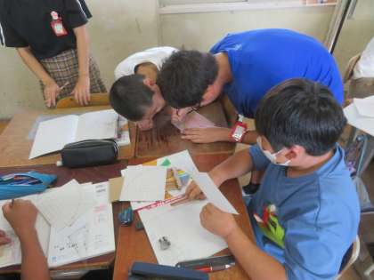 平和ポスターの色塗りを始めました。色合いや水の量に気をつけて塗っています。