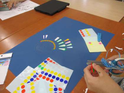 図画工作で○シールを使って「花火」を作りました。コンパスで描いた線にそってシールを貼ります。鉛筆の線をしっかり見ながら作りました。