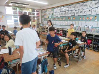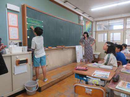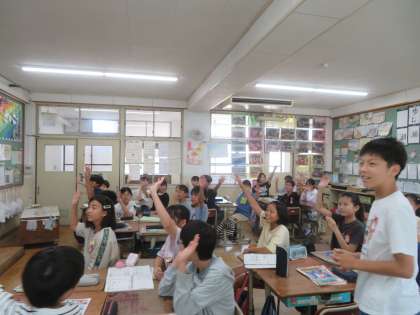 外国語の学習では、アリス先生の発音を聞いて、頭文字は何かを充てるゲームをしました。「R」と「L」の判別や「B」や「V」の判別が難しかったようで、引っかかっていた人もいましたが、最後には結構な人数が聞き取れるようになっていました。