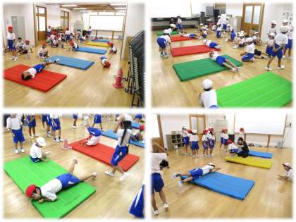 2クラスずつ合同でマット遊びに取り組んでいます。