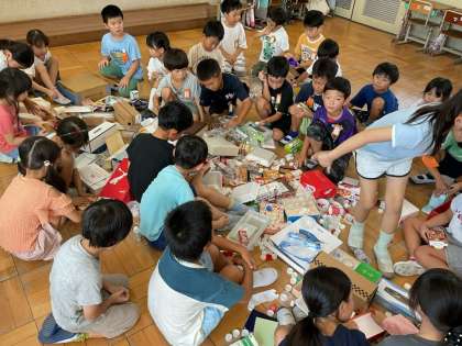 おうちから持ち寄った廃材をもとに、おもちゃ作りを進めています。