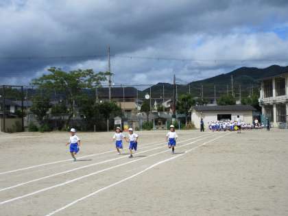 体育で50m走をしました。運動会に向けての練習です。入学する前より走る距離が長くなっても、最後まで一生懸命走ることが出来ていました。