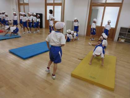 体育科では、マットあそびをしています。しっかり手をつく・足をとじるなど、ポイントをおさえながら練習すると、すぐに上達する子が多いです。