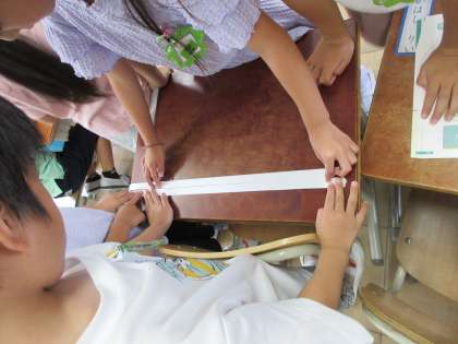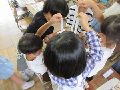 算数科「おおきさくらべ」では、長さや高さを比べる学習をしています。並べたり、テープを使ったりして大きさを比べています。