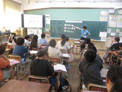 花背山の家での食事は、野外炊事のほかに、食堂を利用して、バイキング形式でご飯を食べます。そこで、栄養教諭の田尻先生から「バイキングにおけるマナー」の話を聞きました。バイキングのマナーはどんなことがあるか、メニューを選ぶときに気を付けることは何か、主催と副菜はどのようなバランスでとればよいのかを考えました。