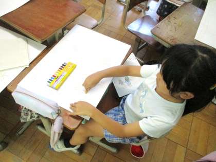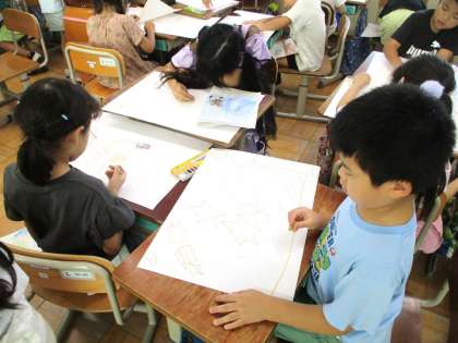 お話をもとに想像を広げて画用紙に下絵を描いています。