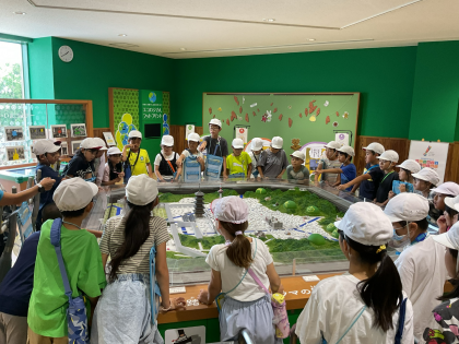 まず、大きなジオラマで、「さすてな京都」の位置や「エコランド音羽の杜(灰の埋め立て地)」の位置を確認しました。京都市には、「南部クリーンセンター」「東部クリーンセンター」「東北部クリーンセンター」の3か所があることを知りました。