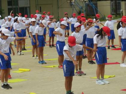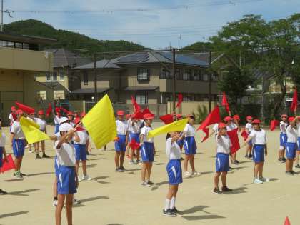 初めて運動場に出て練習をしました。今日は立ち位置など、たくさん修正するところがあり、今回は待ち時間も多かったです。それでも子どもたちは、気持ちよくフラッグを振り抜けたことがうれしかったようでした。