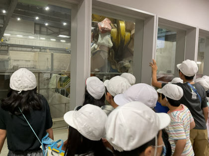 大きなクレーンがゴミを掴んで運んだり、混ぜたりしている様子を見ることができ、迫力のある光景に、歓声が上がっていました。クリーンセンターでは、ごみを燃やすときにできる蒸気で発電をしたり、発生する煙を機械できれいにしたりするなど、環境にもたくさん配慮されていることを知りました。私たちもきちんとごみを分別したり、ごみを減らしたりすることを大切にしていきたいですね。