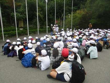無事に山の家に到着して、入所式を行いました。職員さんの話を聞いた後、校歌を歌いながら学年旗を掲げました。一人ひとりが3日間を通して頑張りたいことや目標を書いた学年旗です。学年旗に見守られながら「楽しく学びながら団結力を高めよう!」をめあてに活動していこうと思います。