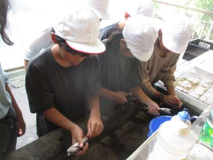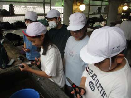 自分でつかんだ魚を夜ご飯に向けて、自分の手でさばきました。魚の腹をはさみで切り開いて内臓を取り出してきれいに下ごしらえをしました。炭で焼かれた魚を食べるのがとても楽しみです。