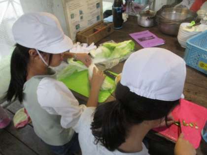 山の家での1度目の野外炊事に挑みました。猫の手を意識しながら野菜を切ったり、水の量を調節しながら米の準備をしたり、かまどの木の組み立てを工夫しながら火の準備をしたりと各々が役割を意識して活動していました。野外炊事が終わった後、子どもたちは「お米が思ったよりべちゃべちゃになった。」「火が何回やってもつかなかった。」「役割分担がうまくいかなかった。」と振り返っていました。振り返りをもとに3日目の野外炊事に挑もうと思います。