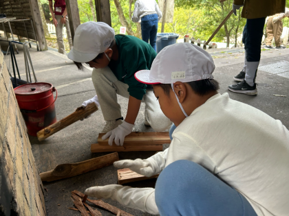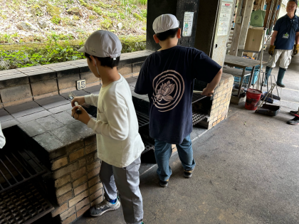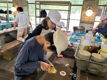 山の家での最後の活動は自分たちで選択したメニューでの野外炊事です。1日目に行った野外炊事での反省点を生かしながら今回の野外炊事に挑みました。火付け係は1発で火が付いたところが多かったり、ご飯は水の量に気を付けておいしく炊けたり、野菜もかたくならずにおいしくできあがりました。どの班も手の空く人なくしっかりと役割分担し、片付けでは「来た時よりも美しく」を実践してとてもきれいに片づけていました。
