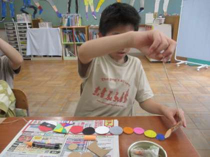 絵を描いてみたり、形で遊んでみたり,今日は,形を紐に通している人もいました。どんな作品になっていくか楽しみです。