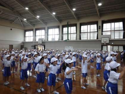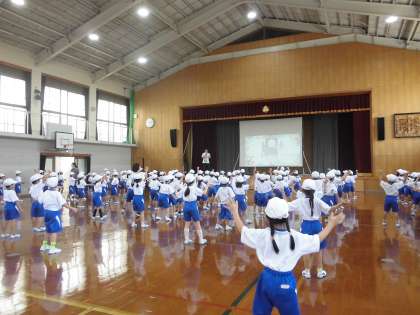 1年生みんなで運動会の練習をしています。みんなで合わせて踊ることは難しいですが、どうしたらいいか、みんなで考えながら練習しています。