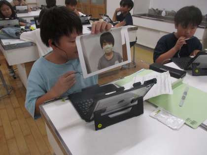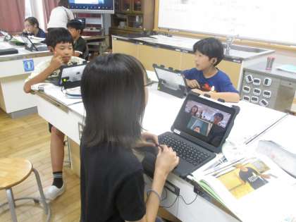 外国語の学習では、明徳小学校、岩倉北小学校、市原野小学校とzoomをつないで、クラスの友だちをほかの小学校の子たちに紹介しました。自己紹介や挨拶、友だちのできることなどコミュニケーションを取りました。子どもたちは、「意外と気さくな人が多くて話しやすかった。」「緊張したけど、いつもより頑張れた。」と終わった後に感想を言っていました。