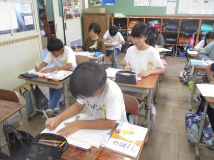 自己選択学習の算数科「面積」は、見通しをもつため、はじめの3時間はみんなで一緒に学習を進めていきます。今日は、4年生までに習った知識を使って、三角形の面積の求め方を考えました。「正方形や長方形の面積の求め方を知っているから使えないかな。」「誰にでも伝わるように説明するのは難しいな。」と言いながら求め方を考えていました。