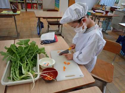 5年生が家庭科で出汁の学習をしてきたことを受けて,6組みんなで「大根葉のお吸い物」を作りました。低学年が「具グループ」,高学年が「出汁グループ」となり,役割分担して調理を進めました。具は,畑で間引きした大根葉,にんじん,かまぼこ。高学年は,昆布出汁,昆布+かつお出汁,薄口醤油と塩で味付けした出汁をそれぞれ試飲して感想も言い合いました。5時間目に調理と試食をしましたが,みんなおいしいと言って,おかわりもして,鍋はすっかり空っぽになりました。