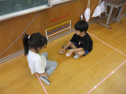 まずは、学校探検でペアになった2年生の作ったおもちゃで遊ばしてもらいました。仲のいいお兄さん、お姉さんに優しく教えてもらってみんな大満足です!