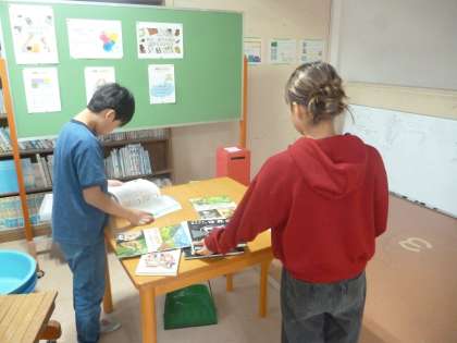 自分で題材を決め、意見文を書く学習をしています。資料を効果的に使いながら、説得力のある文章を書こうと頑張っています。題材を本で探している人もいました。
