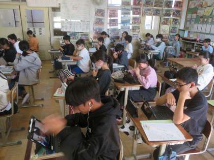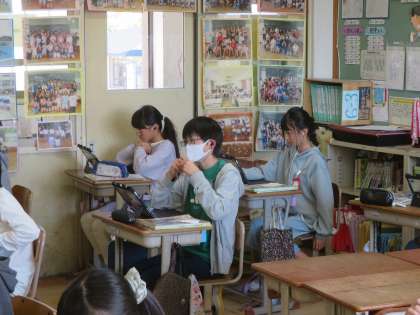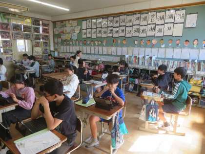 外国語科の学習では、他校の6年生とZoomでやり取りをします。今日は、その練習として教室でやり取りを行いました。みんなばっちりでした。