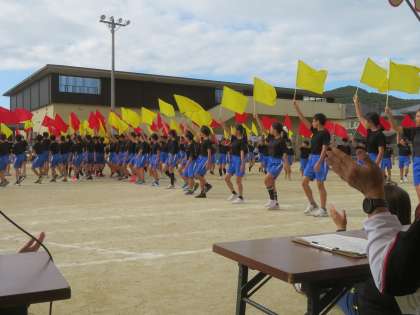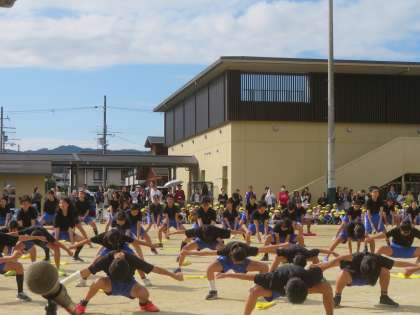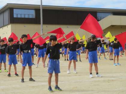 6年生による表現運動「挑戦」の前半部分です。リハーサルでもきれいに揃い切らなかった、ダンスや行進が、ピタッとそろって踊ることができていました。
