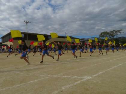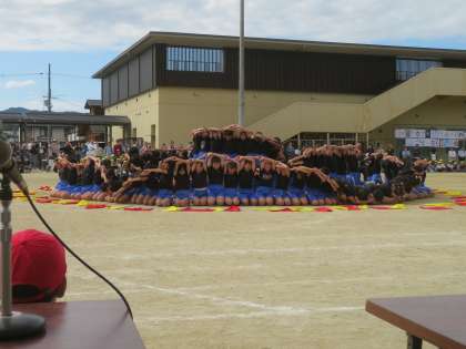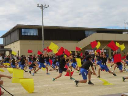 表現運動「挑戦」の後半部分です。ウェーブやフラッグダンスは、応援席や保護者席から、自然と歓声が沸き上がるほどきれいにできていました。