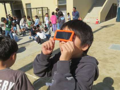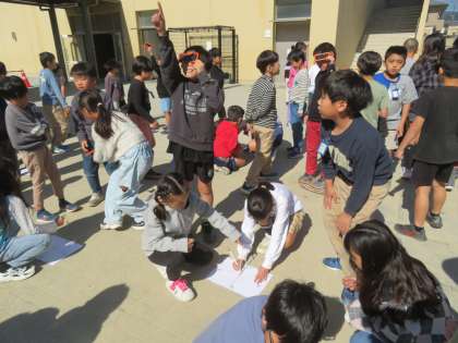 「全然場所が違う!太陽は動いている!」「ほぼ北にピッタリかげができている!」と、気づいたことを交流しながら観察していました。