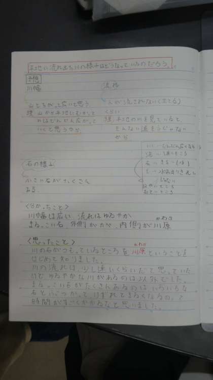 川はばや流れの速さ、岸の様子などについて、話し合いました。