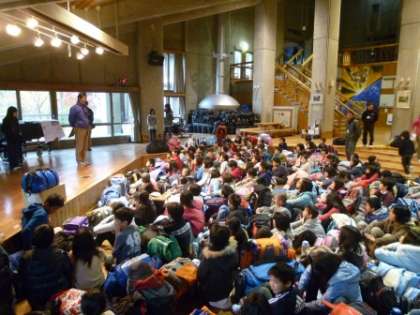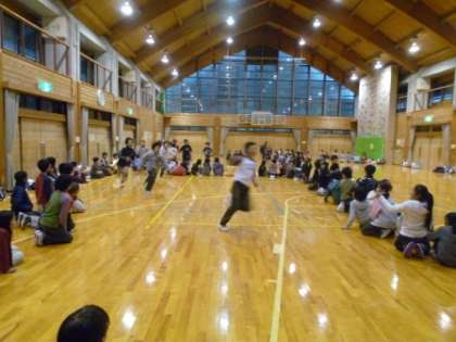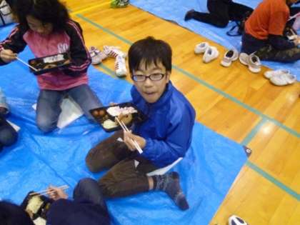 無事に山の家に到着し,1日目のモットー「挑戦」の活動が始まりました。あいにくの雨でしたが,入所式を済ませ,プレイホール(体育館)でレクリエーション活動を行い体を動かしました。その後,山の家弁当を食べました。みんな元気です。