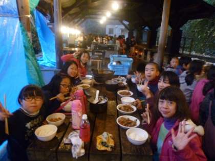 野外炊事は,牛すき焼きです。雨のため,火おこしに苦労しましたが,飯盒でのごはんも上手に炊け,おいしくいただきました。