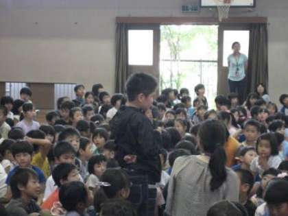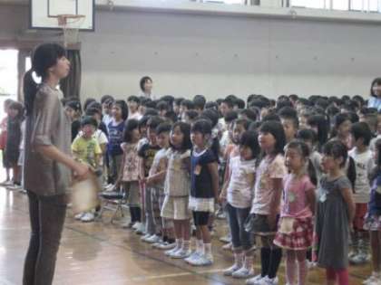 今日は全校児童が体育館に集まって,まず,ベーシックタイムで練習してきた発音・発声の成果を出し合う「第1回発音・発声の全校発表会」を行いました。響く声を大事にする取組を,1年を通して行うことで声を育てることをめあてとしています。今回は中川ひろたかさんの「あいうえおのうた」を暗唱して全員で発表しました。回を重ねることで声を大事にする児童を増やしていきたいです。