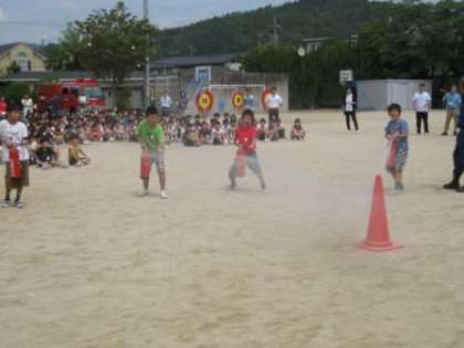 避難時に大切な「お・は・し・も・て(おさない,はしらない,しゃべらない,もどらない,てい学年優先)」を意識して,子どもたちはハンカチを口にあて,スムーズに運動場へ避難をすることができました。避難後は消防署の方の協力のもと,消火器を扱う訓練もおこない,代表の6年生20人が火に見立てたコーンの消火活動をしました。