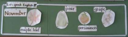 英語の掲示も変わりました。November(11月)です。maple leaf(楓の葉),pear(洋なし),persimmon(かき),grape(ぶどう)をイラストとともに掲示しています。給食時間には英語の歌を放送して日常的に英語に触れる機会を増やしています。