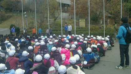 一緒に宿泊学習を行っている鏡山小学校と衣笠小学校と3校合同の朝の集いを玄関前で行いました。各小学校の学校紹介を通して交流をはかりました。宿泊学習中にいろいろなところで顔を合わすことがあると思います。お互いの良いところをたくさん見つけてほしいです。