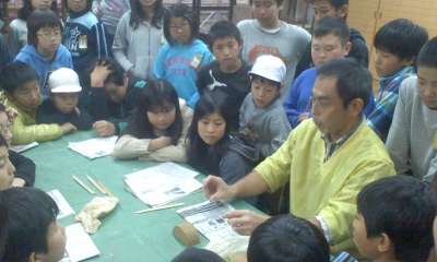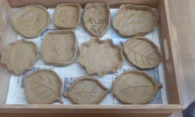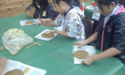 花背焼きの製作中です。すばやくつくるのが上手くつくる秘訣です。高速で粘土のおだんごを作って,手のひらで叩いて広げます。周りを盛り上げて,お皿が一丁出来上がり!