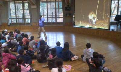 自然観察は残念ながら雨のため室内での学習になりました。オリエンテーションホールで山の家の近くで見られる動物について学習しました。夜になると鹿やタヌキ, イノシンが餌を求めて山からおりて来ます。センサーカメラがとらえた夜の動物の様子を見せてもらいました。