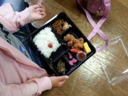 宿泊棟のミーティング室でクラスごとに「からあげ弁当」をいただきました。