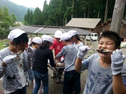 つかんだ魚は,はさみでさばいて串焼きに。内臓を手でとるのは,少しにゅるにゅるしていて気持ち悪かったけれど,炭火でやいたら最高!魚さん,いただきます。