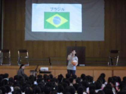 ワールドカップが開催された「ブラジル」は,日本と反対側にあります。日本からとても遠い国です。その近くに「ニカラグア」という国があります。本校教員が青年海外協力隊として派遣されていた2年間の生活から「ニカラグア」について写真を提示しながら話をしました。日本とは違う国で生活をしてみて,改めて日本のよさに気付き,また,ニカラグアという国の良さも知ったということでした。世界中にはたくさんの国があって,たくさんの人がいます。歴史やことば,食べ物,文化もそれぞれですが,日本の良さをたくさん知り,日本以外の国の良さもたくさん見つけていってほしいと思います。