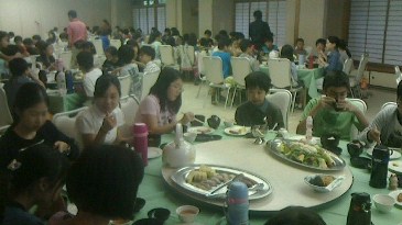修学旅行も2日目を迎えました。5時40分ごろ、東の空からきれいな朝日が昇りました。今日も良い天気になりそうです。6時の起床,洗面,寝具の片付けなどを終えた子どもたちは,お腹をすかせて朝食会場へ。全員7時に席につき,大きな声でいただきます。おいしくいただきました。今日の活動が楽しみです。