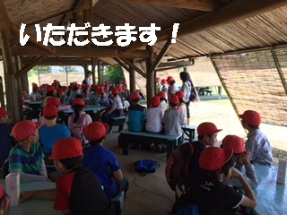 みさきの家に到着後,東屋(あずまや)で持参弁当を食べました。みんな,もりもり食べていました!食べ終わった子は,しおりを見ながら休憩していました。