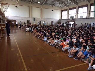 理科室からの出火を想定した避難訓練を行いました。朝までの雨のため,体育館への避難となりました。放送があってから,子どもたちは,避難時に大切な「お・は・し・も・て(おさない,はしらない,しゃべらない,もどらない,てい学年優先)」を意識して,スムーズに体育館へ避難をすることができました。