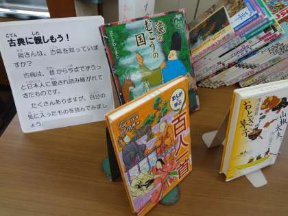 古典とは,文学,音楽,美術,演劇,伝統芸能,演芸,生活文化など古くから大切に受け継がれてきた文化的財産のことをいいます。岩倉南小学校でも,図書室に「古典コーナー」を設置し関係する図書を紹介したり,給食室横の掲示板に「古典の日」の掲示をしたり,子どもたちに古典に興味をもってもらうように取り組んでいます。また,ベーシックタイム(発声・発音の時間)で,百人一首を詠む機会を作っています。