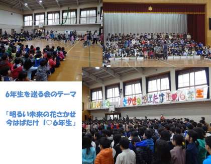 6年生を送る会が3月14日(月)の1,2時間目に行われました。1年生と一緒に,6年生が入場してきました。今年の6年生を送る会のテーマは「明るい未来の花さかせ 今はばたけ Iラブ6年生」です。全校児童で歌を歌った後,6組,各学年から感謝の気持ちを込めて,歌や言葉,寸劇などをプレゼントしました。(教職員も歌で,気持ちを伝えました。)その後,6年生からメッセージと歌のプレゼントがあり,大きく成長した姿に胸が熱くなりました。