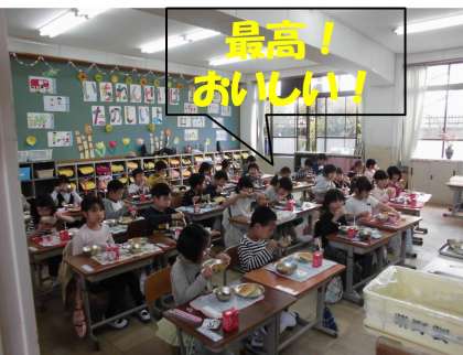 今日の給食は,子どもたちの大好きなスパゲティです。デザートのりんごゼリーもついています。週一回のパンの日でした。1年生の子どもたちは,今日もしっかり食べ,各クラスとも完食でした!